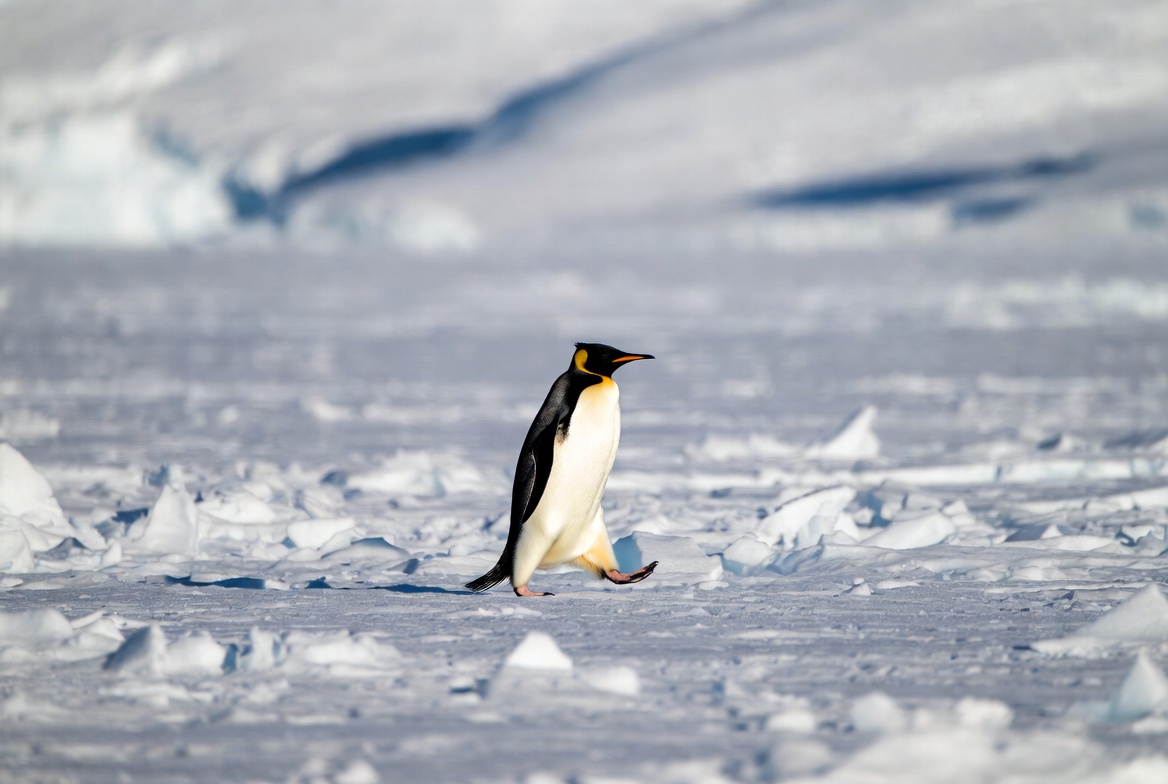 - A lone emperor penguin breaking from the group