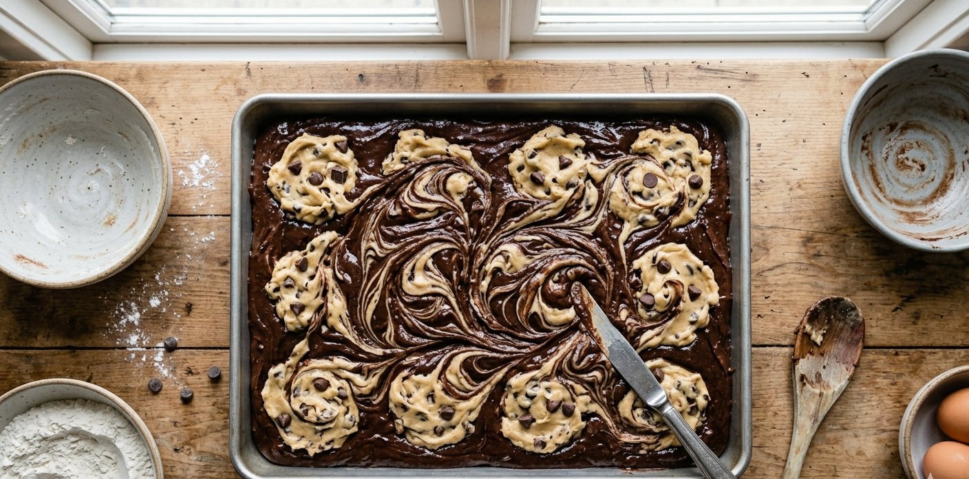1. Assemble the brookies: Spread brownie batter evenly in the prepared pan. Drop cookie dough by spoonfuls on top and gently spread it. Don’t worry about perfect coverage – the layers will swirl beautifully while baking.